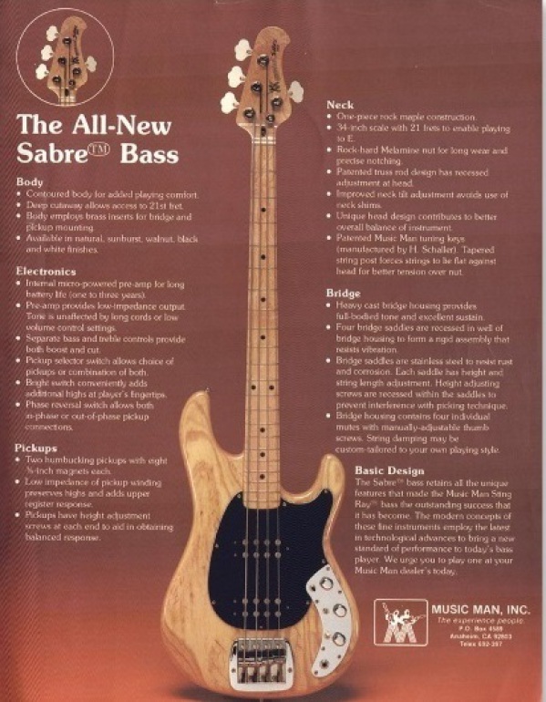 The production Sabre Basses have always had their "C00xxxx" prefixed serial numbers located on a top loaded bridg. Bodies are contoured and never slab. Rosewood was initially used for fretless only. Fretted Rosewood was offered as an option to Maple from late 1979 and, at the same time, Ebony replaced Rosewood for fretless. The 2EQ preamp boards are non-epoxy. Two variations of the preamp were used with their boards marked either "B4" or "B5". Initially, toggle switches were used on the control plate but were replaced with a single lever switch from late 1982 onwards. In conjunction with the lever switch, a 2EQ Sting Ray preamp board (marked "B3") replaced the two origial preamp board variations. Ernie Ball purchases Music Man in March 1984 and initialy continues producing the Sabre Bass. See